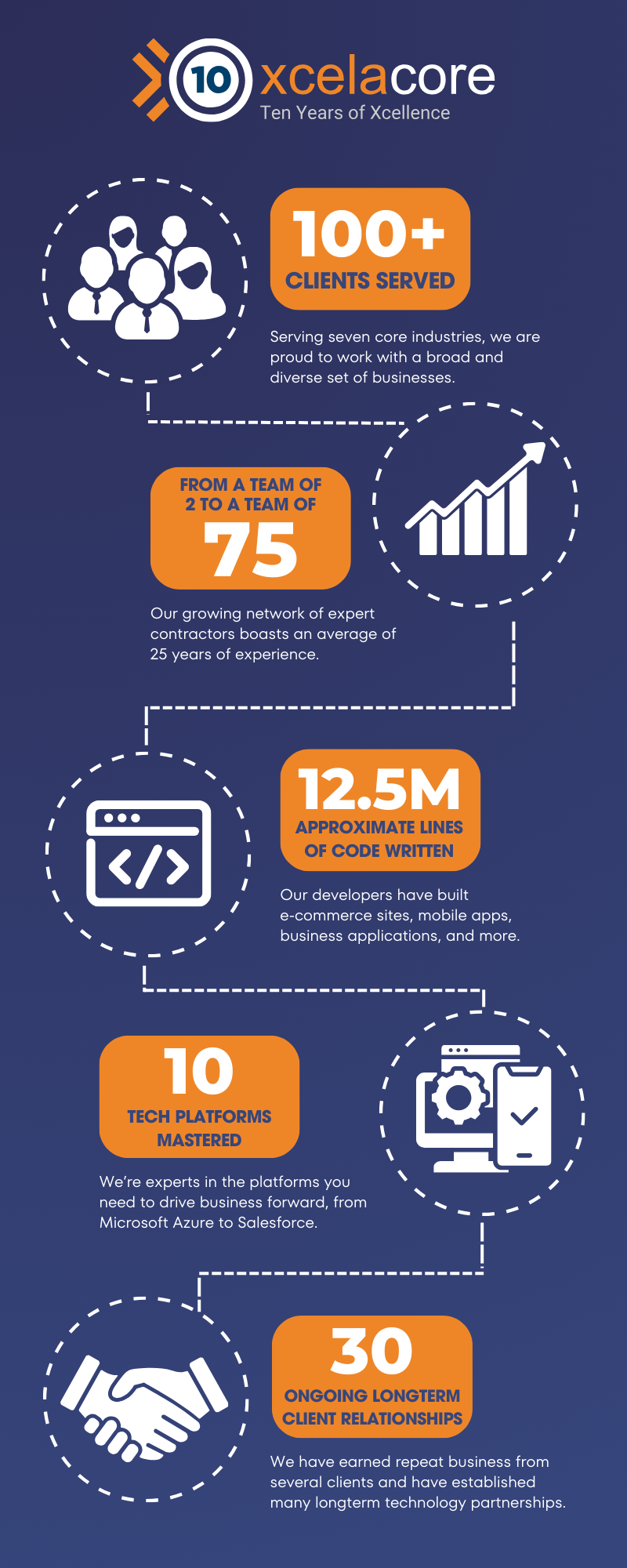 Xcelacore celebrates a decade of delivering on our mission to drive business forward for our clients. Look back with us at how we’ve embraced innovation, understood our clients’ most critical business challenges, and delivered results with flexible and cost-effective strategies.