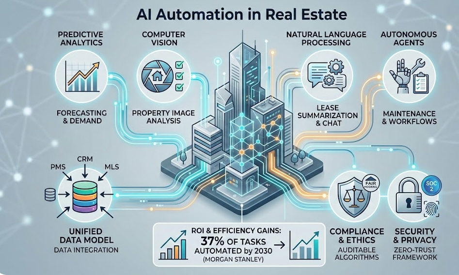 Artificial intelligence (AI) has moved from novelty to necessity in real estate. Property managers, brokers and institutional investors operate in an environment of thin margins, rising regulatory scrutiny and fragmented data. The Buildium 2026 property management report found that AI adoption among property management companies jumped from 20 % in 2024 to 58 % in 2025, yet only about 8 % have fully automated any processes. Owners still cite maintenance support as their top reason for hiring managers and 75 % of managers reported increased rental fraud, showing the operational pressure and risk landscape. At the same time, Morgan Stanley’s research concluded that AI can automate 37 % of tasks across real estate operations, unlocking $34 billion in efficiency gains by 2030. Automation promises to reduce labour, improve tenant experience and enhance decision quality, but the gap between expectation and execution remains huge: a survey of commercial asset managers found that 92 % have started or plan AI pilots yet only 5 % achieve their goals.