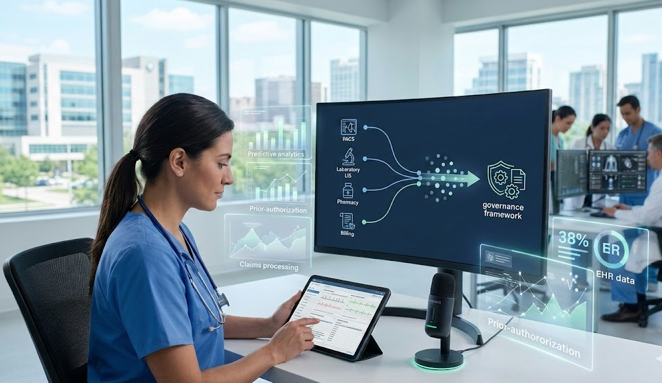 Premier Inc. estimates that roughly 71 % of U.S. hospitals had integrated some form of AI into daily operations by late 2025. These integrations range from simple voice dictation to advanced analytics. But success isn’t measured by adoption alone; it comes from improved outcomes and operating leverage. Ambient AI scribes have reduced consultation length by 26 % and lowered clinician burnout by over 20 %. Predictive models like Epic’s Deterioration Index reduced mortality by 27 % in pilot sites, and health systems deploying agentic AI expect at least 10 % cost savings. At the same time, nearly 80 % of healthcare organizations now use AI within their electronic health records (EHR) systems, yet only 18 % have mature AI governance structures.